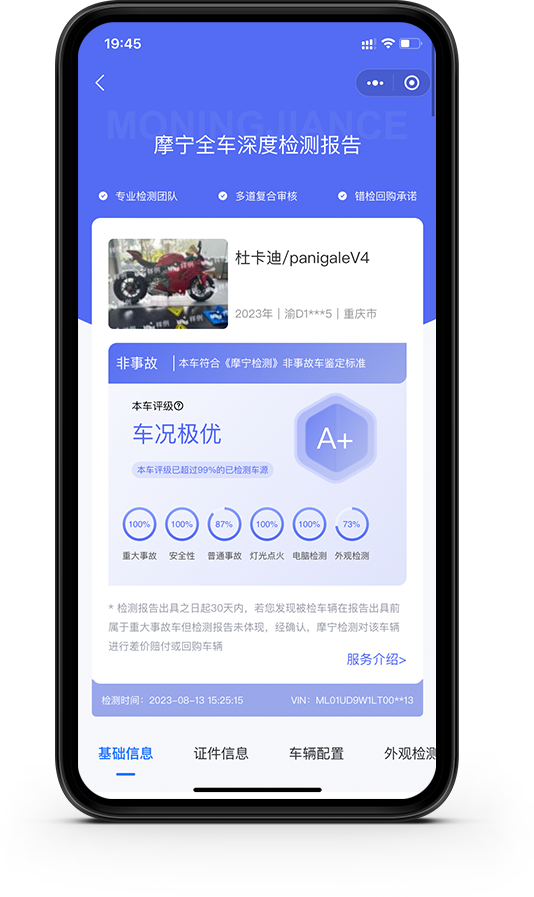 重庆摩宁机动车鉴定评估有限公司是一家集线上、线下服务于一体的具有专业性的摩托车第三方检测机构和代客买卖摩托车的企业,成立于2020年9月30日,注册资金100万元人民币,注册地址位于重庆市南岸区弹子石街道求新村4号附1号1-1。摩宁检测秉持专业、公正、严谨、独立的原则,致力于打造鉴定有规范、保障有体系的平台,有效解决二手摩托车车况不透明的问题,改善长期以来摩托车交易买卖双方信息不对称的状况。不仅拥有优良的服务品质,而且还拥有先进的技术设备与科学且符合法律法规的管理体系,可以为客户提供高水准、全方位的检测服务。